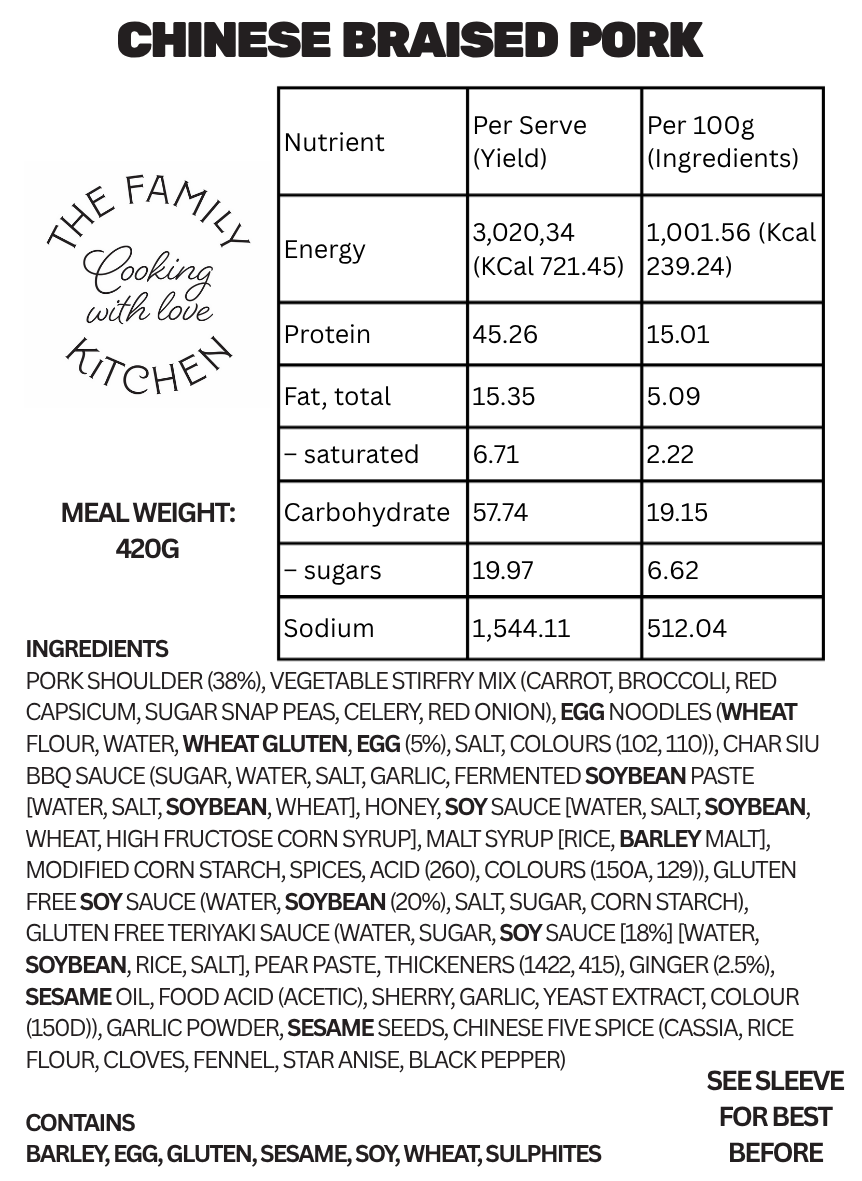 Tender braised pork shoulder tossed in a rich blend of char siu, teriyaki, and soy sauces for that authentic Chinese BBQ flavour. Served over classic egg noodles with a vibrant mix of stir-fried vegetables, sesame seeds, and a touch of five spice — this dish brings bold, balanced flavour with a focus on wholesome ingredients and satisfying taste.