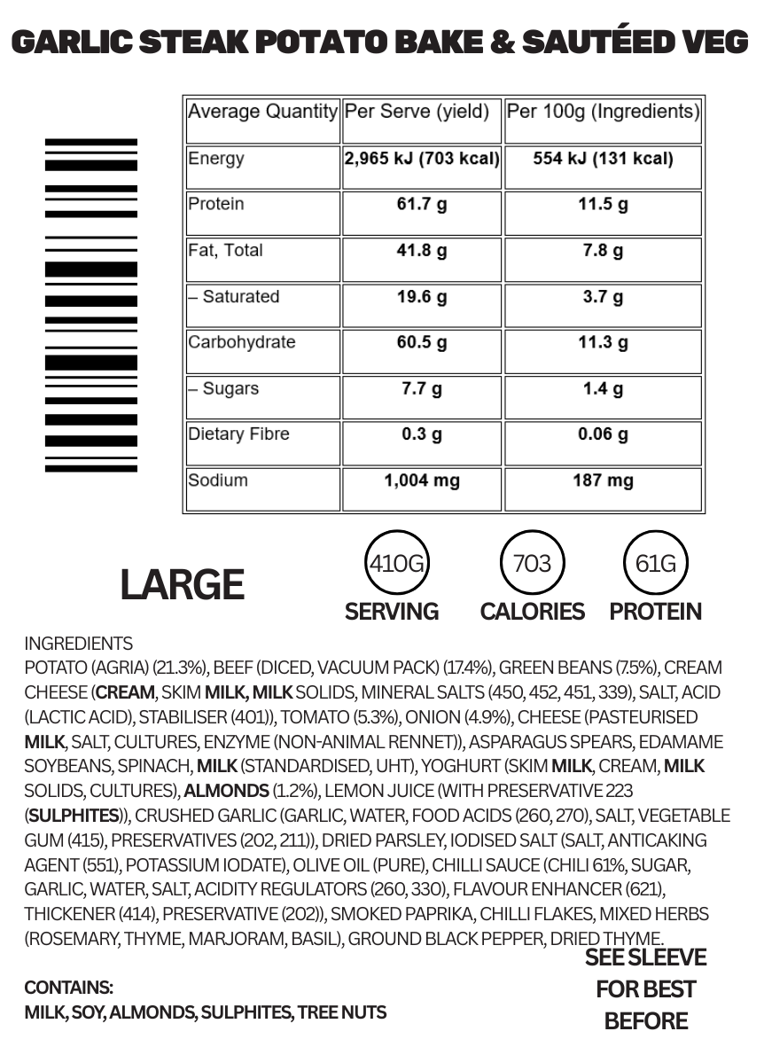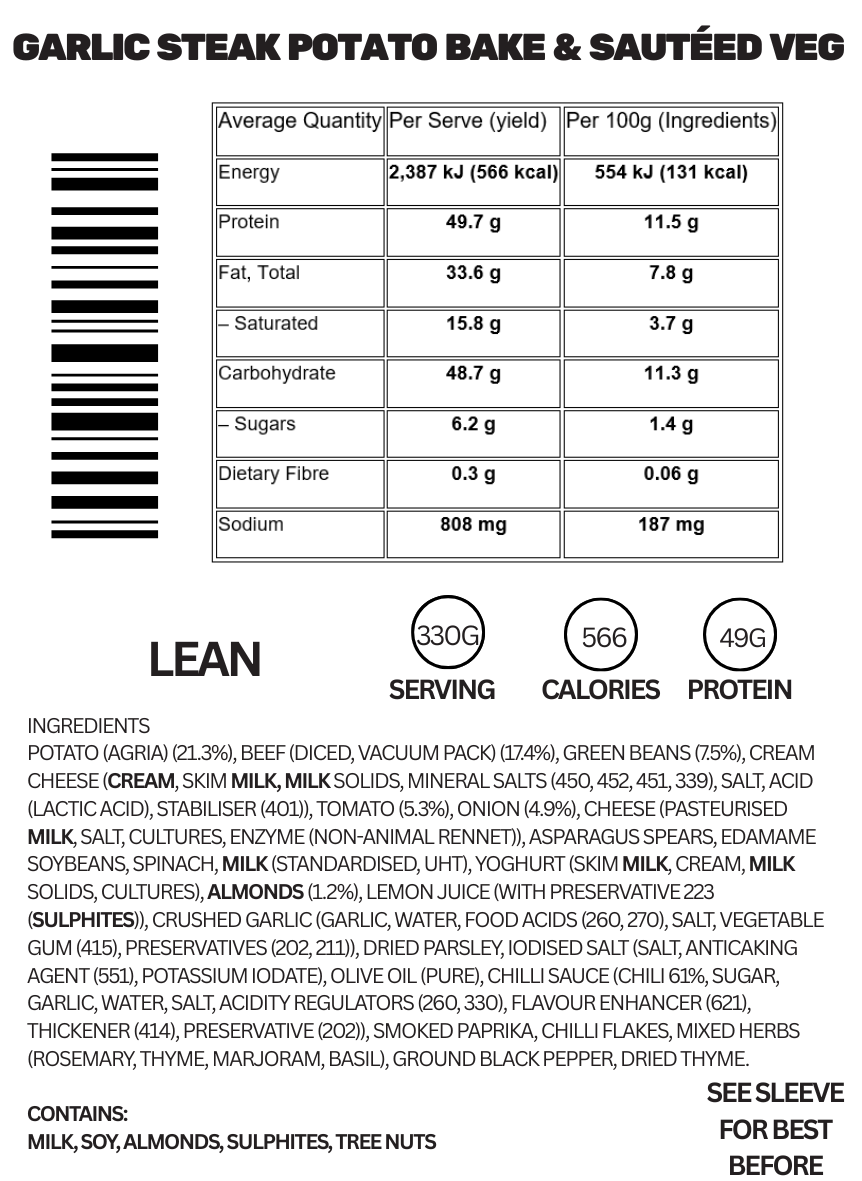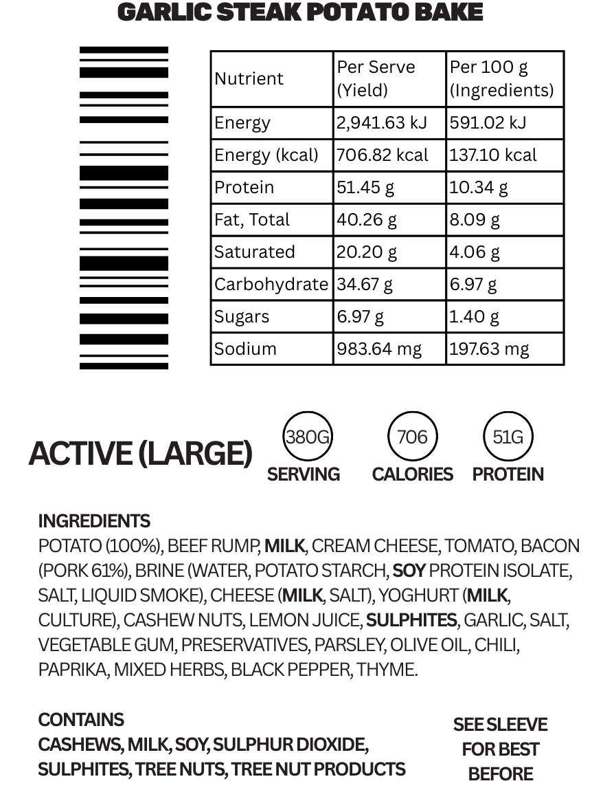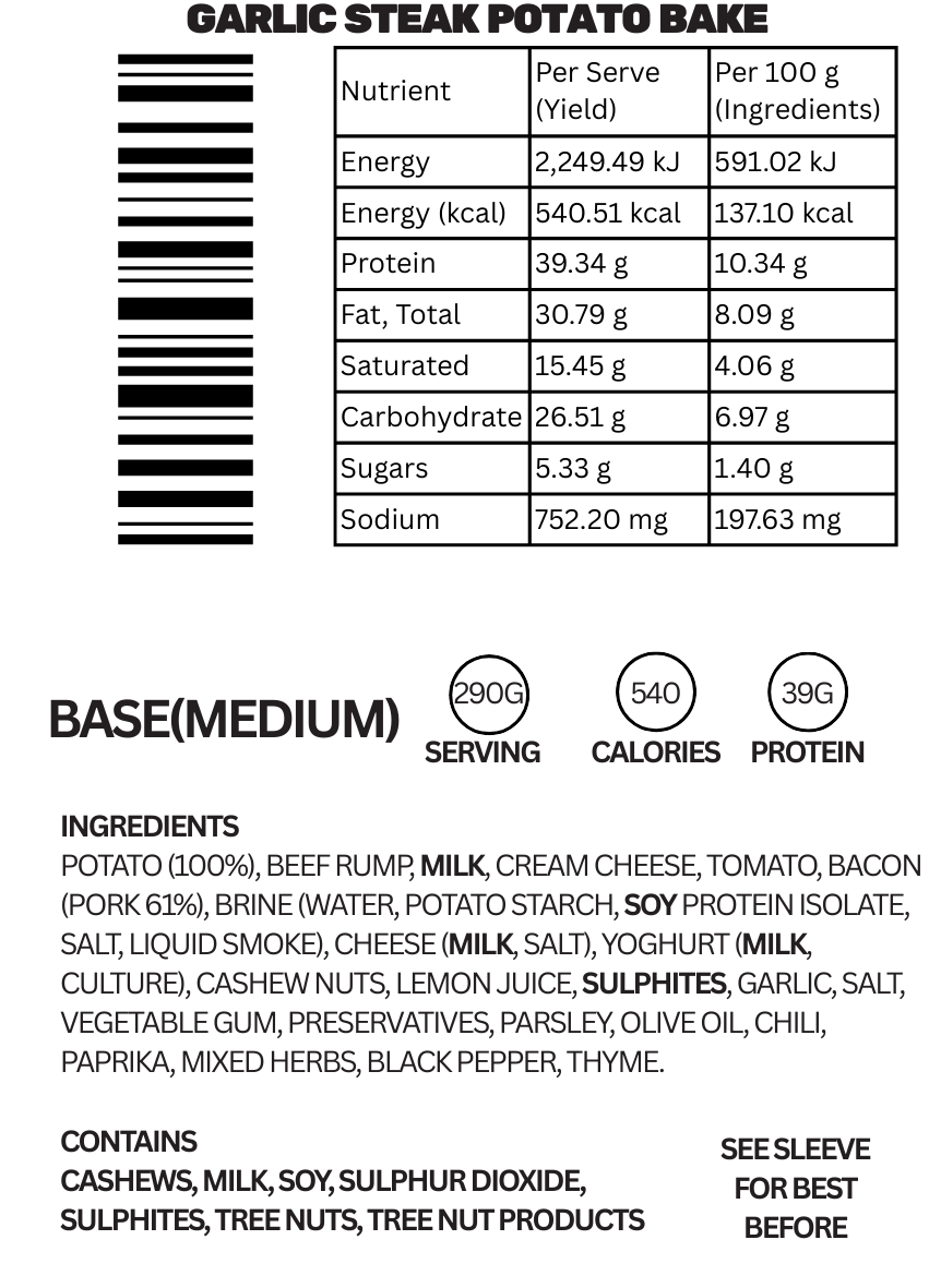 This dish features tender, diced Agria potatoes, succulent prime steer beef rump, and a rich blend of cream cheese and grated tasty cheese, all enhanced by the smoky flavor of diced bacon. Fresh tomatoes and zesty lemon juice add a bright, tangy note, while a mix of garlic, parsley, and thyme infuses the dish with aromatic herbs. Finished with a hint of heat from hot Sriracha sauce and chili flakes, this bake is both satisfying and comforting—perfect for a nourishing meal.